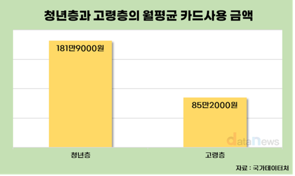 29일 데이터뉴스가 국가데이터처의 사회적 관심계층의 생활특성 분석 자료를 분석한 결과, 고령층와 청년층의 월평균 카드사용 금액간 2.1배의 격차가 나타났다. 고령층과 청년층의 월평균 카드사용금액은 85만2000원, 181만9000원으로 집계됐다.