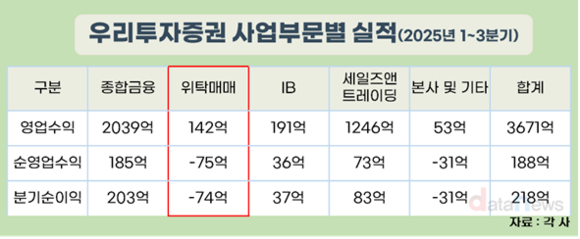 15일 데이터뉴스가 금융감독원 전자공시시스템에 공시된 우리투자증권의 분기보고서를 분석한 결과, 지난해 1~3분기 순이익은 218억 원으로 집계됐다.