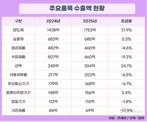 반도체는 1753억 원의 수출액을 기록하며 전년(1438억 원) 대비 21.9% 증가했다. 2년 연속 큰 폭의 증가세를 기록하며 역대 최대 실적을 기록했다. 수출 비중(25%) 또한 역대 최대로 2025년 수출을 견인했다.