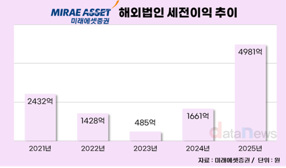 미래에셋증권의 해외법인이 역대 최대 실적을 갈아치웠다. 지난해 세전이익이 4981억 원으로, 2024년 발표한 기업가치제고계획에서 제시했던 '2030년까지 해외법인 세전이익 5000억 원'에 대한 조기달성 기대감이 높아졌다.