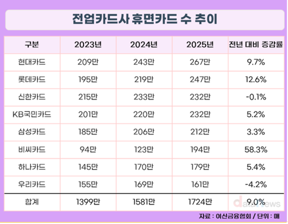 16일 데이터뉴스가 여신금융협회 공시정보포털에 공시된 전업카드사의 휴면카드 현황을 분석한 결과, 지난해 말 8개 전업카드사의 휴면 신용카드는 총 1724만 장으로 집계됐다. 전년(1581만 장) 대비 143만 장(9.0%) 늘었다.