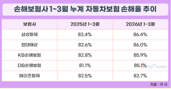 보험사별로는 삼성화재가 86.4%로 가장 높았고, 현대해상과 KB손보 DB손보도 86.0%, 85.9%, 85.1%로 85%를 넘겼다. 메리츠화재는 82.7%로 집계됐다.