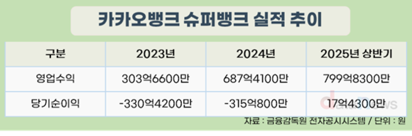 슈퍼뱅크는 출범 이후 눈에 띄는 성장세를 보이고 있다. 이에 카카오뱅크의 실적으로 반영되는 순이익도 개선됐다. 2023년 -330억4200만 원에서 2024년 -315억800만 원, 2025년 상반기 17억4300만 원으로 흑자 전환에 성공했다.