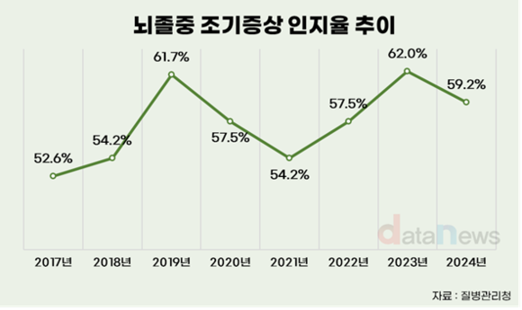 29일 데이터뉴스가 질병관리청의 집계를 분석한 결과, 뇌졸중의 조기인싱 인지율은 59.2%로 집계됐다. 성인 10명 중 5~6명만 조기증상을 인지하고 있어, 여전히 조기증상에 대한 인지율이 높지 않은 것으로 나타났다.