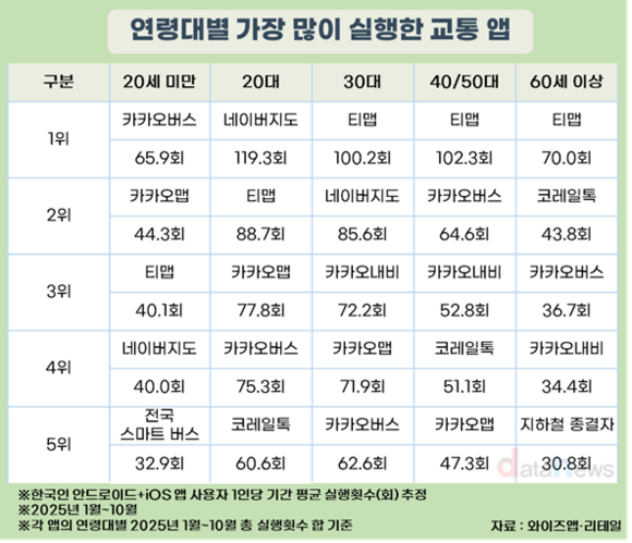 26일 데이터뉴스가 와이즈앱리테일의 '연령대별 1인당 가장 많이 실행한 교통 관련 앱' 자료를 분석한 결과, 연령대별로 주로 사용하는 앱이 달랐다.