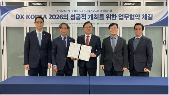 12월 22일 오후 2시 한국인터넷신문협회에서 (사진 왼쪽부터)한국인터넷신문협회 방두철 부회장, 김기정 회장, DX KOREA 2026 조직위원회 권평오 위원장, 박종근 기획위원장, 박춘종 운영위원장이 업무협약을 체결하고 있다. (사진제공=한국인터넷신문협회)