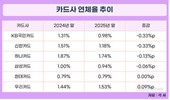 삼성카드의 연체율도 2024년 말 1.00%에서 2025년 말 0.94%로 0.06%p로 개선됐다. 현대카드는 전년과 같은 0.79%로 업계 최저 수준을 유지하고 있다. 실수요자 중심의 금융상품 운영과 선제적 리스크 관리에 영향을 받았다.