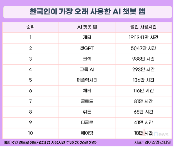 11일 데이터뉴스가 와이즈앱리테일의 한국인이 가장 오래 사용한 AI 챗봇 앱 자료를 분석한 결과, 제타가 사용 시간 1위를 기록했다. 안드로이드와 iOS 합계 기준으로 한달간 사용시간이 1억 1341만 시간을 기록했다.