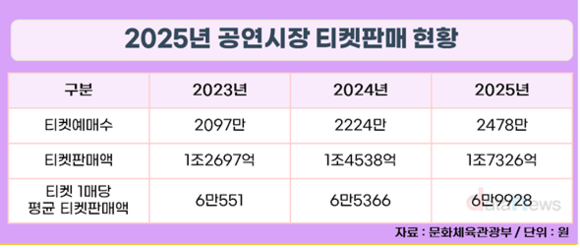 12일 데이터뉴스가 문화체육관광부의 '2025년 공연시장 티켓판매 현황 분석 보고서'를 분석한 결과, 2025년 국내 공연시장의 평균 티켓 판매가는 약 7만 원으로 지난해보다 5000원 가량 상승했다.