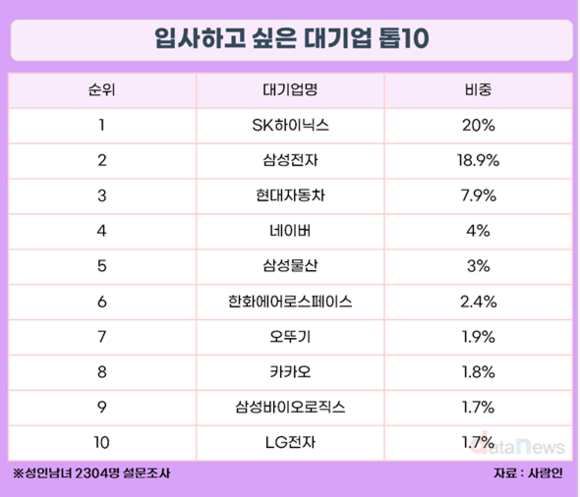 16일 데이터뉴스가 사람인의 '입사하고 싶은 대기업(성인남녀 2304명 대상)' 자료를 분석한 결과, SK하이닉스의 응답률이 20%로 선두를 차지했다.