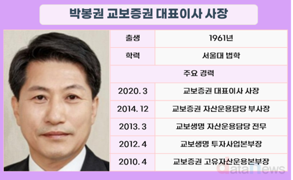 교보증권은 박봉권·이석기 각자대표 체제로 운영되고 있다. 두 대표 중 박 대표는 2020년 3월 취임했다. 이달 말 임기 만료 예정이었으나, 26일 진행될 교보증권의 정기주주총회에 박 대표의 사내이사 연임에 대한 안건이 상정되면서 사실상 연임이 확정됐다.