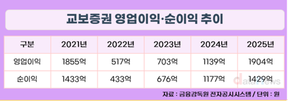 교보증권의 순이익은 2021년 1433억 원으로 최대 실적을 경신했다. 부동산 프로젝트파이낸싱(PF) 여파로 2022년에는 433억 원까지 줄었으나, 2023년 676억 원, 2024년 1177억 원, 2025년 1429억 원으로 회복에 성공했다.
