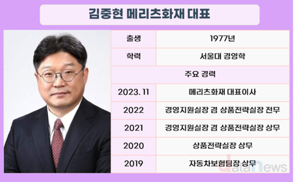 김 대표는 1977년생으로 서울대 경영학과를 졸업했다. 2015년 메리츠화재에 입사했으며, 자동차보험팀장, 상품전략실장, 경영지원실장 등을 지냈다. 2023년 11월 메리츠화재 대표이사 부사장으로 취임했으며, 2025년 대표이사 사장으로 취임했다.