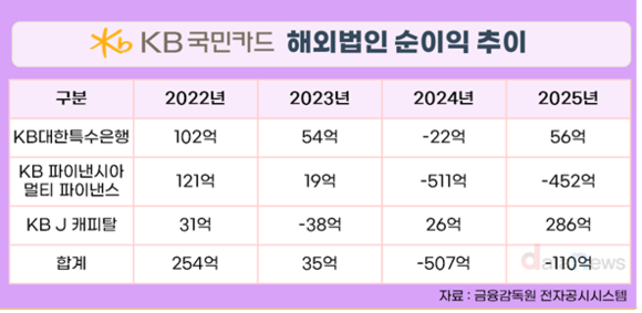 반면 KB 파이낸시아 멀티 파이낸스는 적자를 이어가고 있다. 2024년 -511억 원에서 2025년 -452억 원으로 손실 규모를 줄였지만, 인도네시아의 경기 둔화, 금리 상승 등에 발목을 잡혔다.